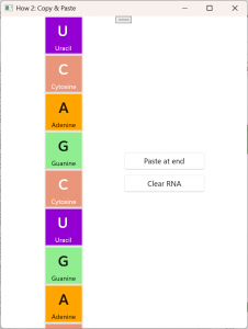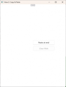 Let’s start with the user experience (it is a good habit to always start with the user experience). We start the program with a blank screen. To paste the clipboard content, there will be a button “Paste”. The button is disabled if there is nothing useful in the clipboard. When the user clicks the button, the program will copy the nucleotide sequence from the clipboard to the end of our RNA sequence.