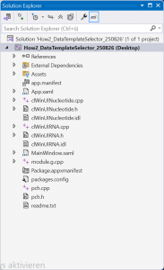 We have an App class (and exactly one instance) which holds everything together. The app class creates an instance of the MainWindow class during startup. So, this class is a good place to store our RNA. There, you will find the member m_WinUIRNA which is an instance of clWinUIRNA. To display the RNA, MainWindow implements a user control clWinUIControl_RNAList.xaml. This is where you find the <ListView> control which will display our RNA with its nucleotides.