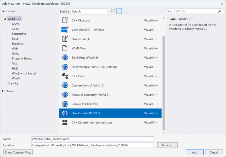 Finally, we need a (XAML) class to display the RNA. We create a user defined control which we will implement in Mainframe.xaml. Let’s the project wizard do the main work.